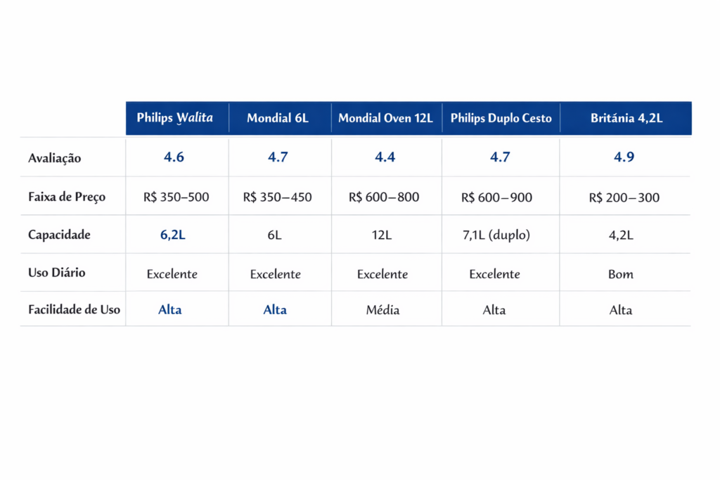 Neste comparativo, você vai ver as cinco melhores air fryers do mercado atualmente, considerando desempenho, durabilidade, capacidade e custo-benefício.